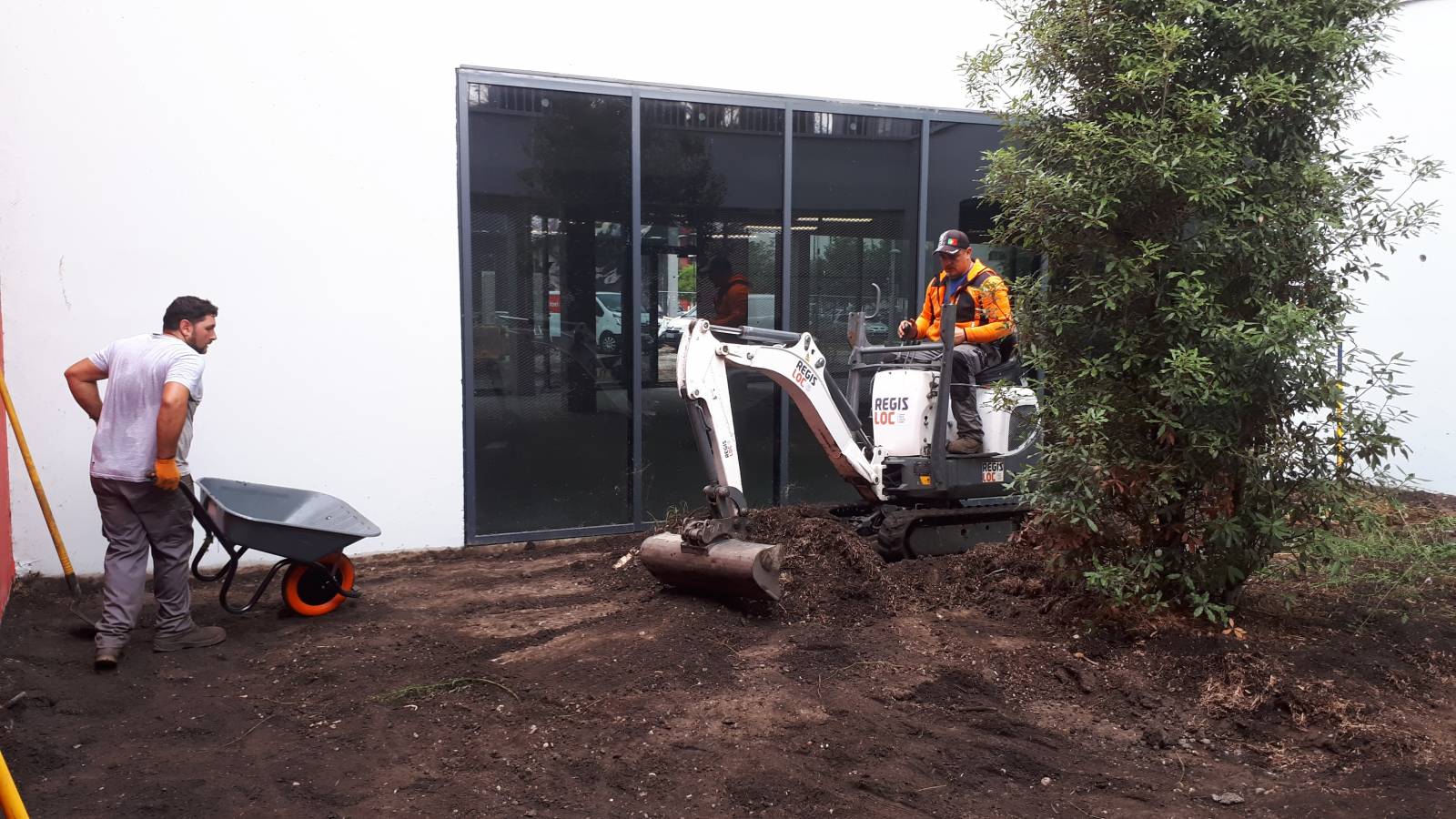 Votre paysagiste France Espace Vert répond également à des appels d'offre d'aménagement pour professionnels, collectivités et communes. Pour ce projet, nous sommes intervenu avant le reste des entreprises car le patio se trouvait au centre du bâtiment et il fallait faire venir une mini-pelle afin de défricher le patio en vue de l'aménagement. Nous avons donc enlevé et évacuer ces déchets verts et quelques centimètres de terre afin de mettre en place notre aménagement.