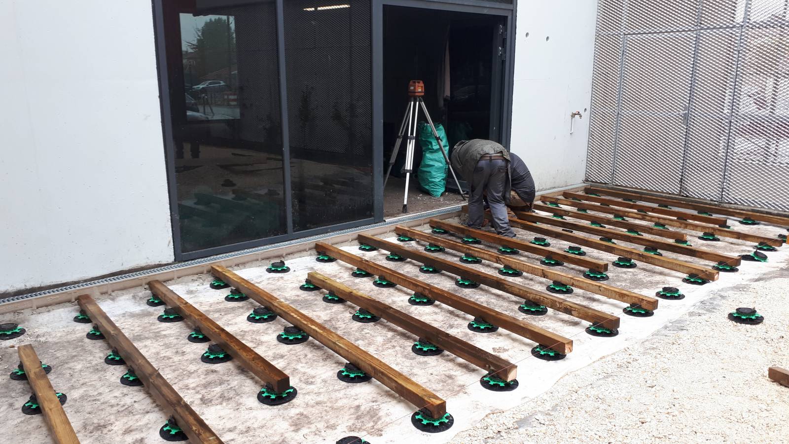 Nous avons commencé par installer une terrasse en bois posée sur plots ainsi que des caniveaux pour l'évacuation des eaux de pluie.