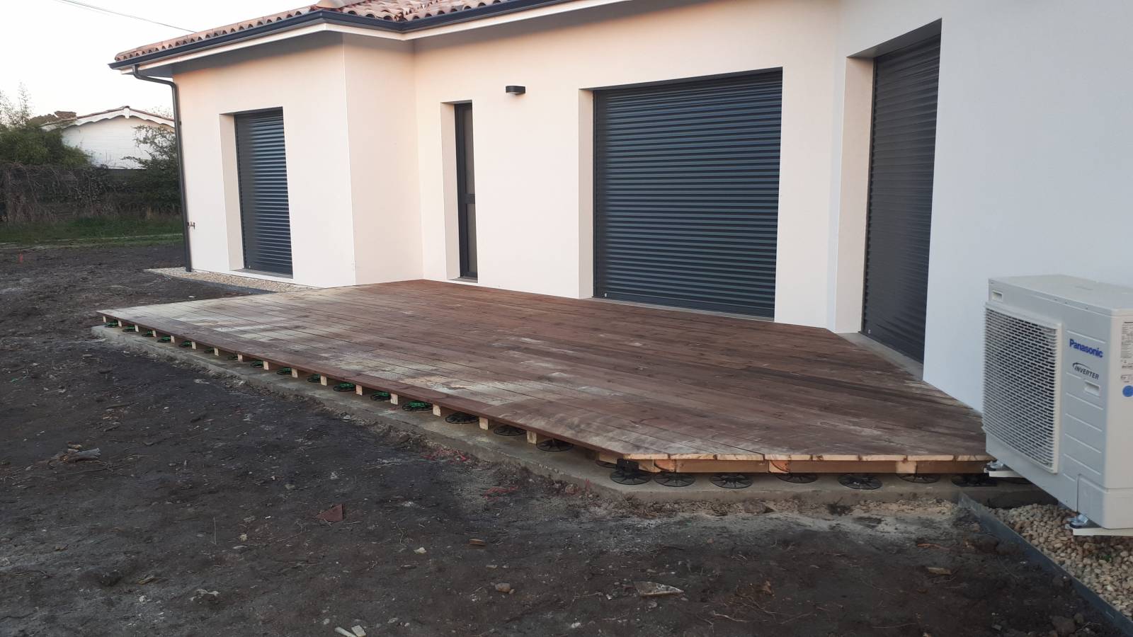 Création d'une terrasse de 200m2 en carrelage 80x80cm posés sur plots entourée par trois rangées de lames d'ipé posés sur une ossature bois sur plots à Cestas proche de Bordeaux.