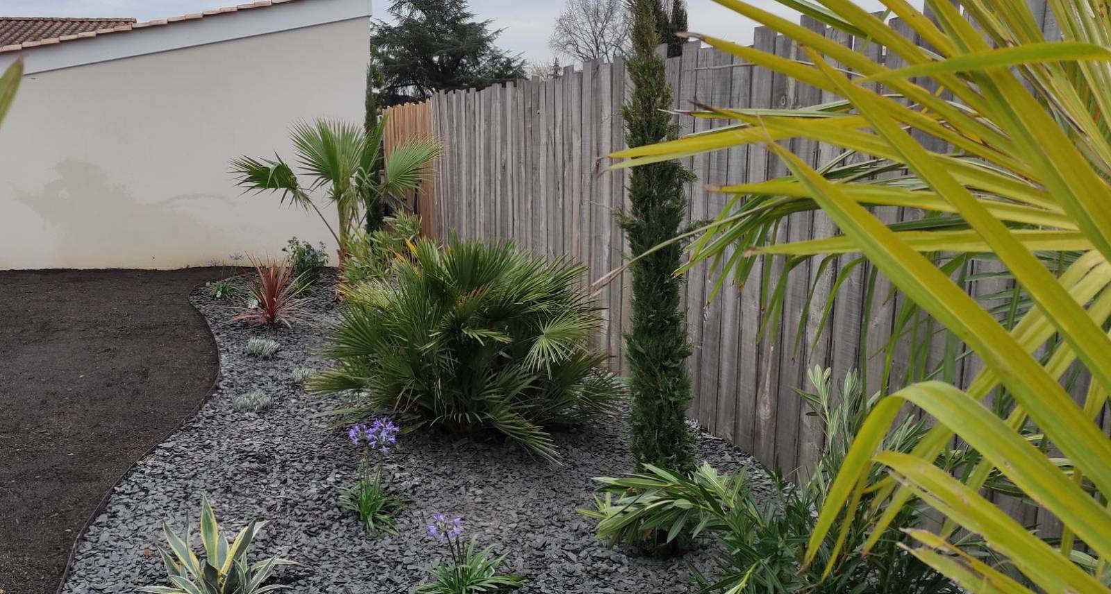 Vient ensuite les plantations avec un olivier, un pin parasol, des trachycarpus, un washigtonia, un phoenix, des agapanthes, des lauriers roses, des cyprès de Provence, une oranger du Mexique, des lavandes ou encore des agaves americana.